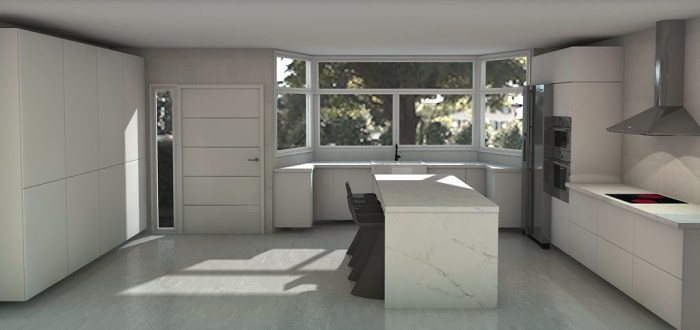 Proyecto de diseño en infografía 3D. Se trata de convertir lo que actualmente es un salón, en una cocina con acceso al porche trasero. El cliente buscaba luminosidad, líneas minimalistas y un amplio espacio para almacenar.
