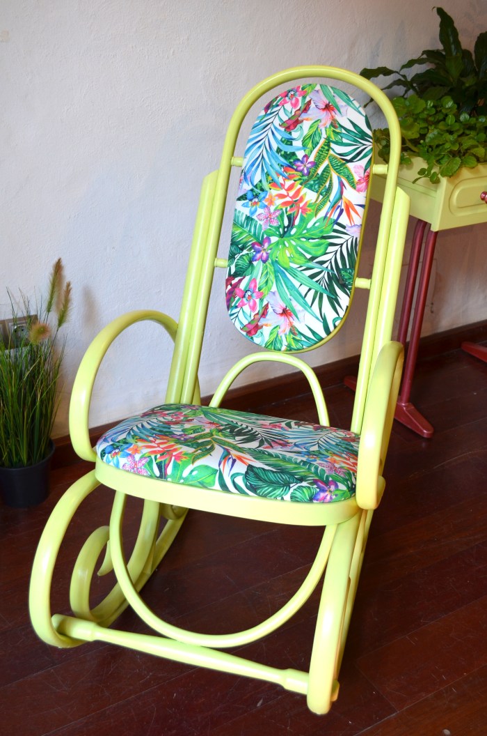 De estar en el trastero, a ser la reina de la casa. Se sustituyó el asiento y respaldo por un bonito tapizado de estampados tropicales. El color verde lima le da luz y frescura combinando perfectamente con la tela elegida.